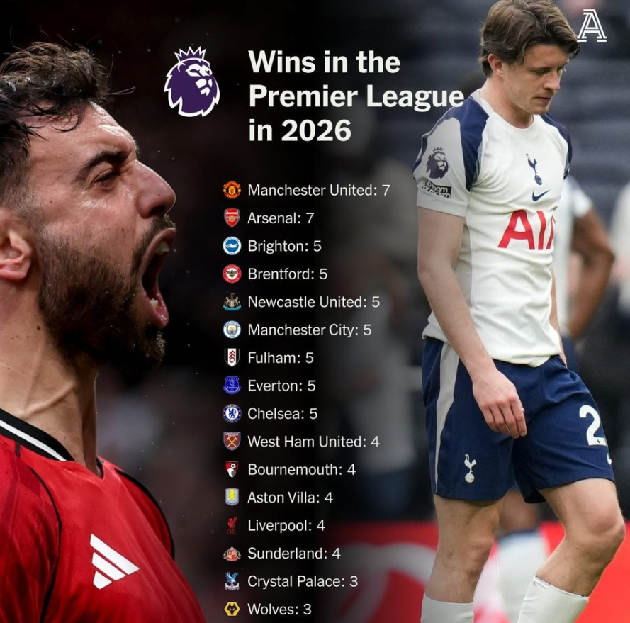 从各队2026年的胜场分布来看,曼联和阿森纳均拿下7胜领跑;布莱顿、布伦特福德、纽卡斯尔联、曼城、富勒姆和埃弗顿等队也都有5场胜利入账。